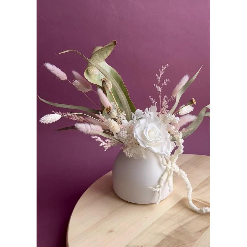 Композиция из сухоцветов и стабилизированных цветов в белом кашпо