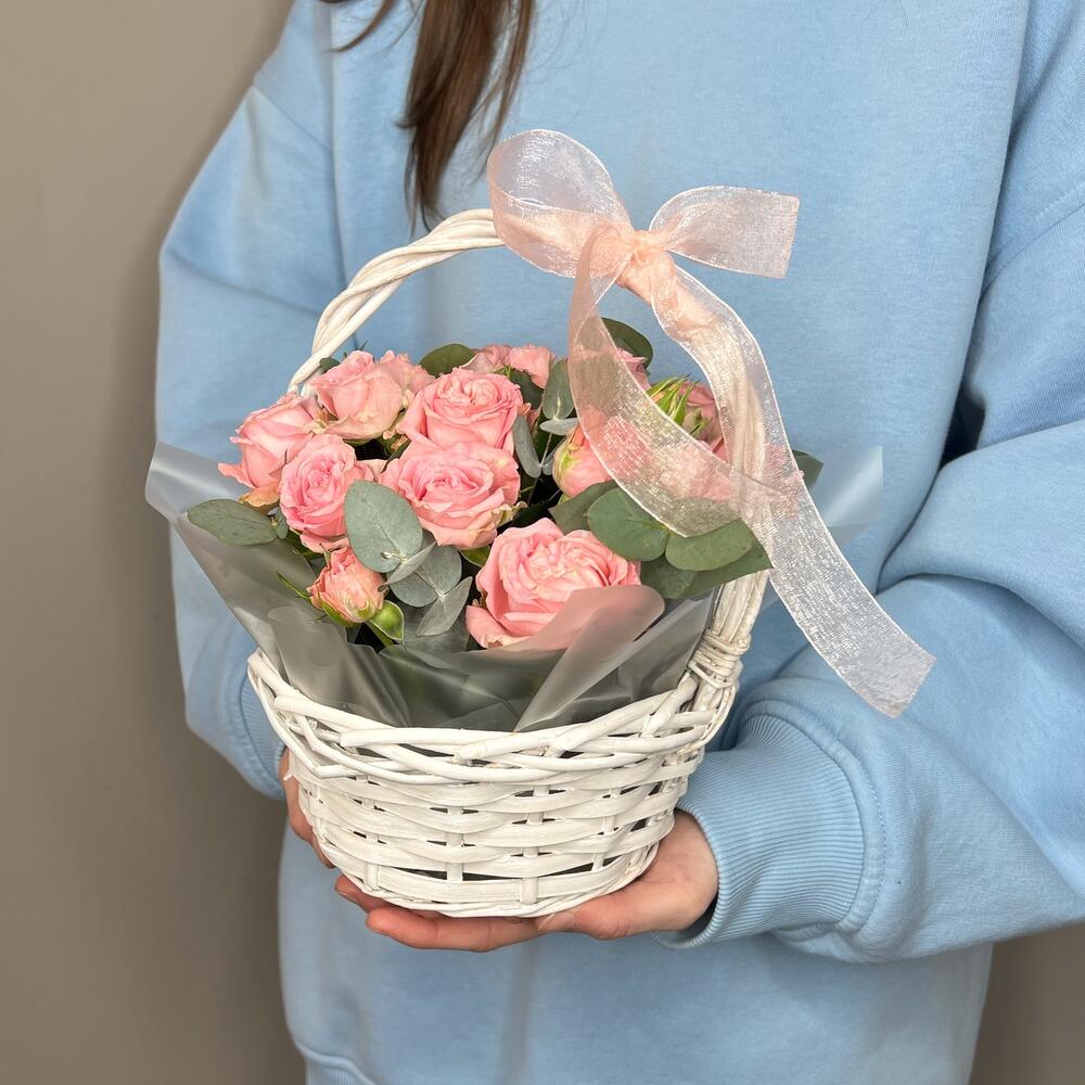 Роза кустовая пионовидная – 4 шт.Корзина плетеная – 1 шт.комплимент от polyanka – 1 шт.