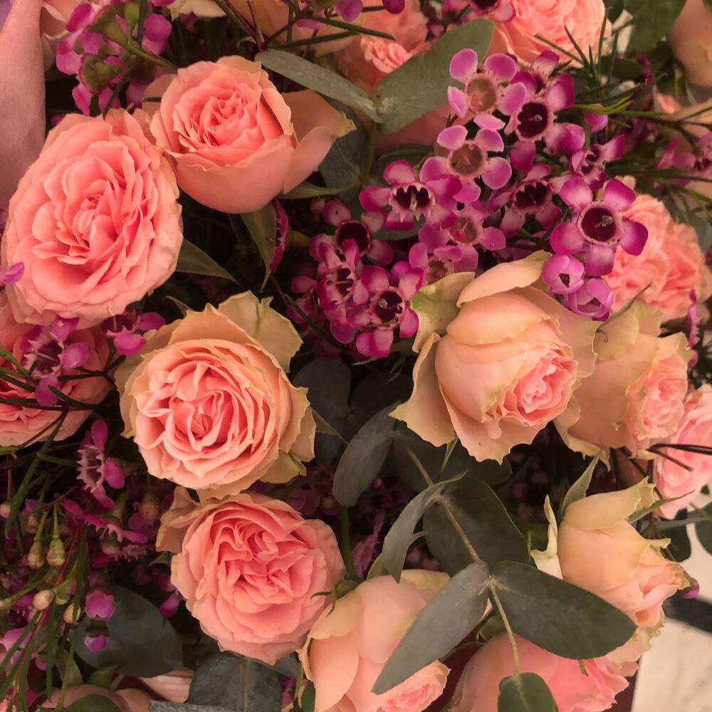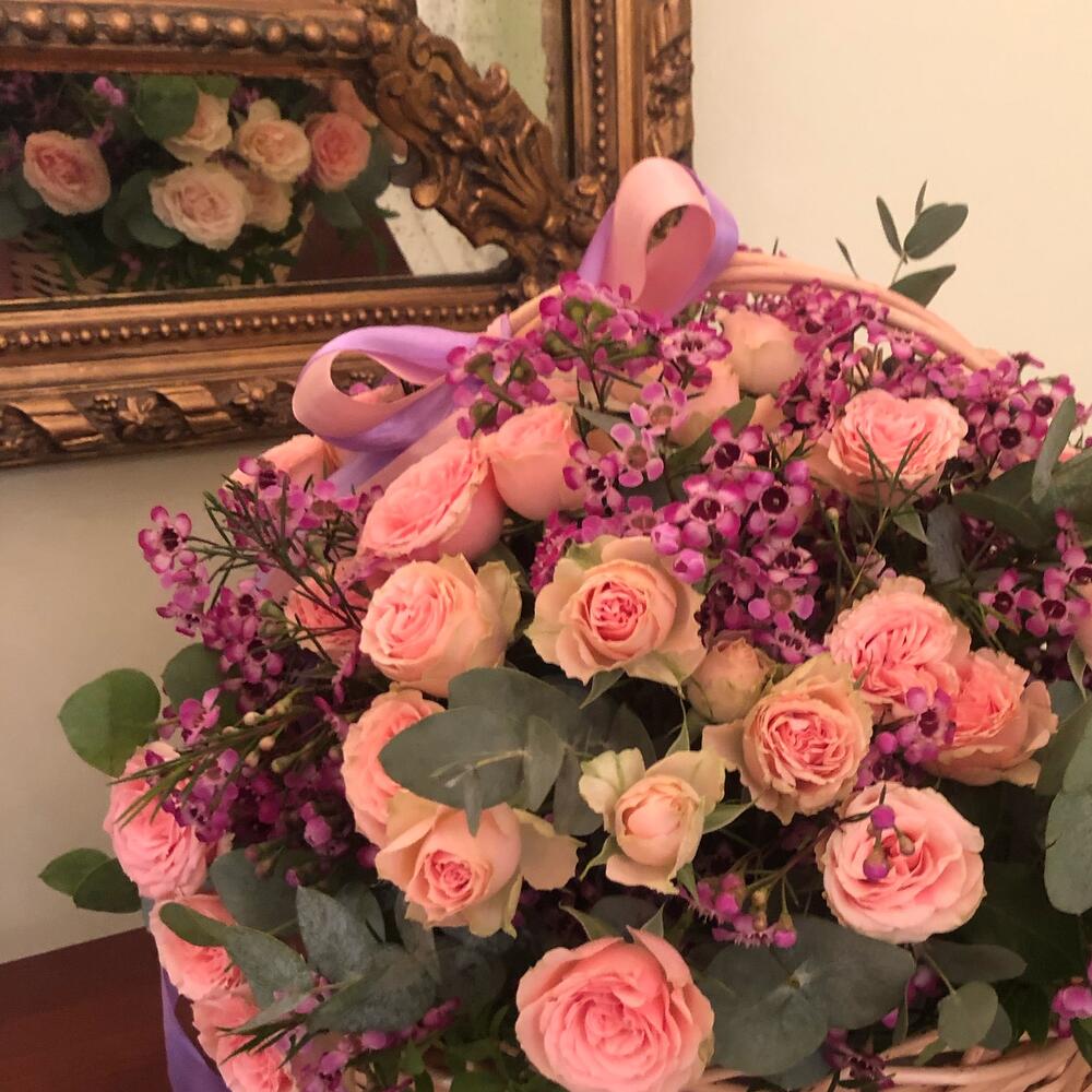 Кустовая роза – 11 шт.Ваксфлауэр – 3 шт.Эвкалипт Baby Blue – 7 шт.Оазис флористический – 1 шт.Корзина плетенная – 1 шт.