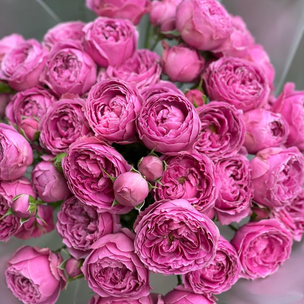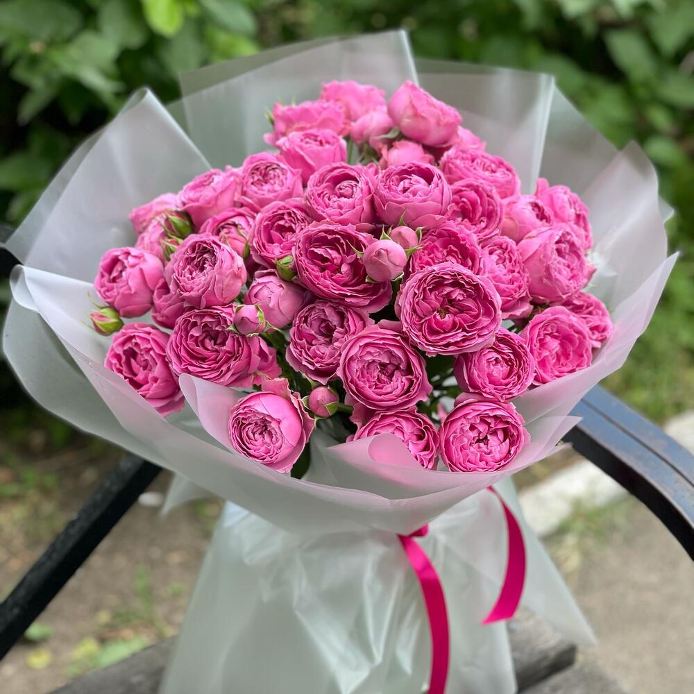 Роза кустовая пионовидная – 13 шт.Оформление матовая пленка – 7 шт.Лента – 1 шт.