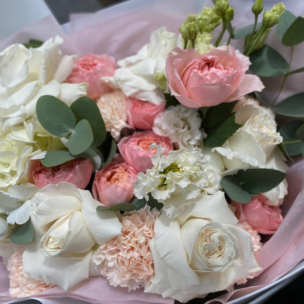гортензия белая (колумбия) – 1 шт.Роза французская пионовидная – 5 шт.джульетта роза пионовидная – 1 шт.Диантус – 5 шт.Лизиантус Алиса белый – 1 шт.Эвкалипт цинерея – 5 шт.Пистаж – 2 шт.Тишью – 4 шт.Фоамиран (упаковка) – 4 шт.Лента атласная – 2 шт.хризал для срезанных цветов – 1 шт.инструкция по уходу за цветами – 1 шт.