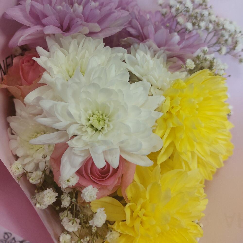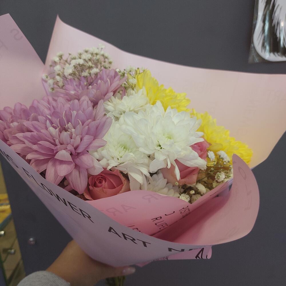 Хризантема кустовая – 3 шт.Роза Кенийская – 3 шт.Гипсофила – 3 шт.Упаковка дизайнерская – 2 шт.Лента атласная – 1 шт.
