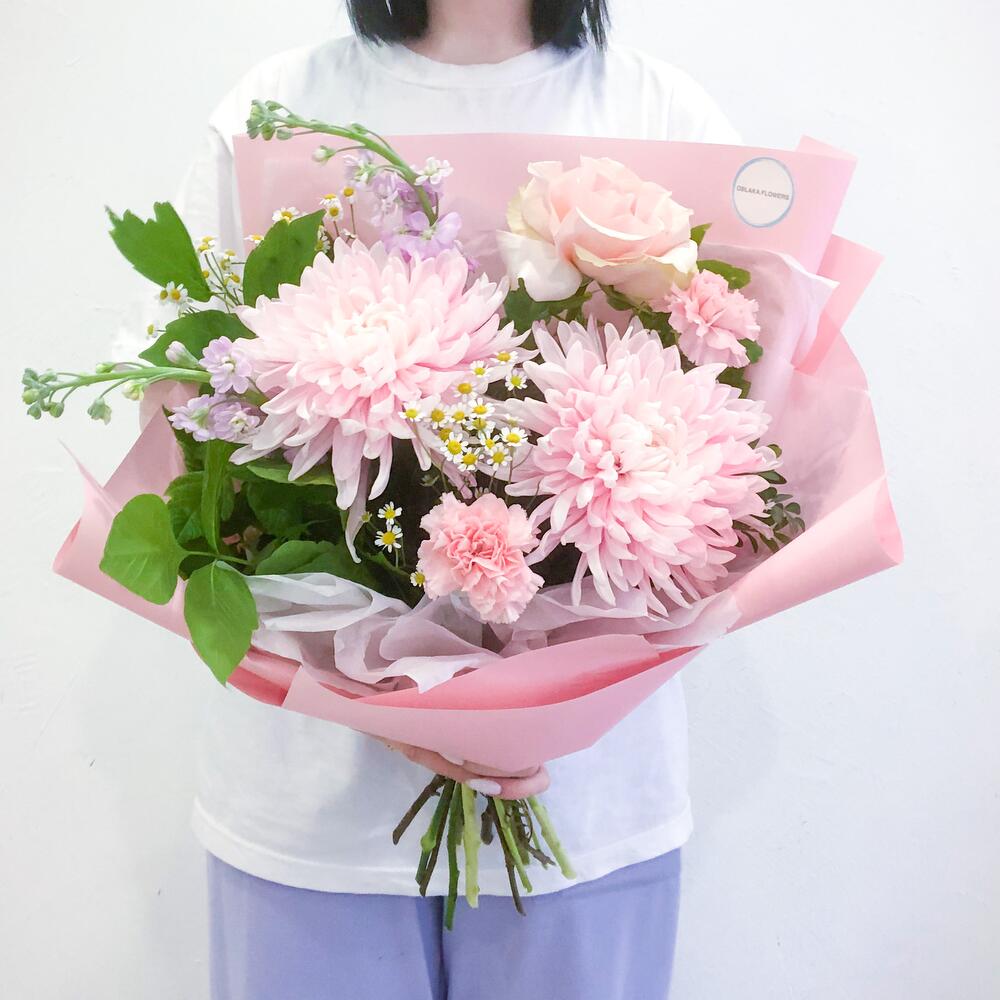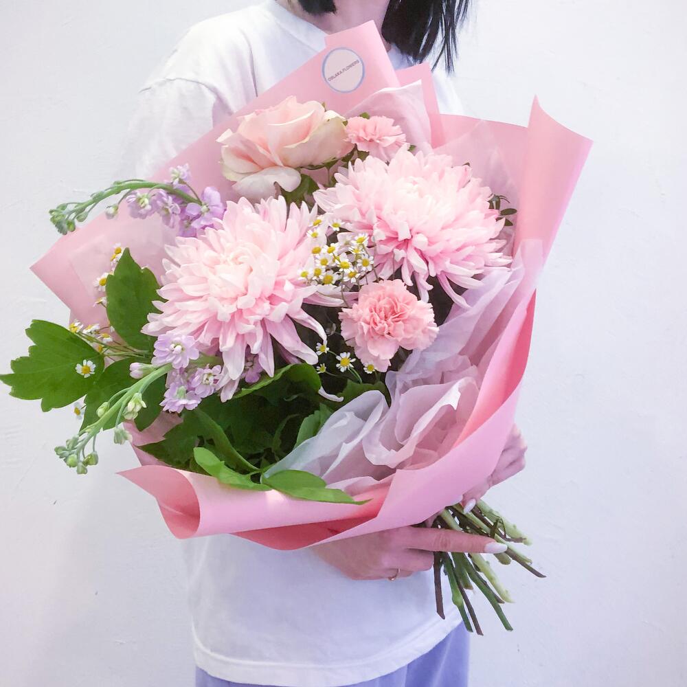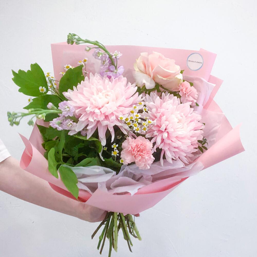 Маттиола – 2 шт.Лента атласная – 1 шт.Тишью – 1 шт.Диантус – 2 шт.Матрикария – 3 шт.Фисташка – 3 шт.Хризантема Антонов – 2 шт.Роза французская – 1 шт.Аквапак – 1 шт.Корейская пленка – 3 шт.ветки декоративные – 2 шт.