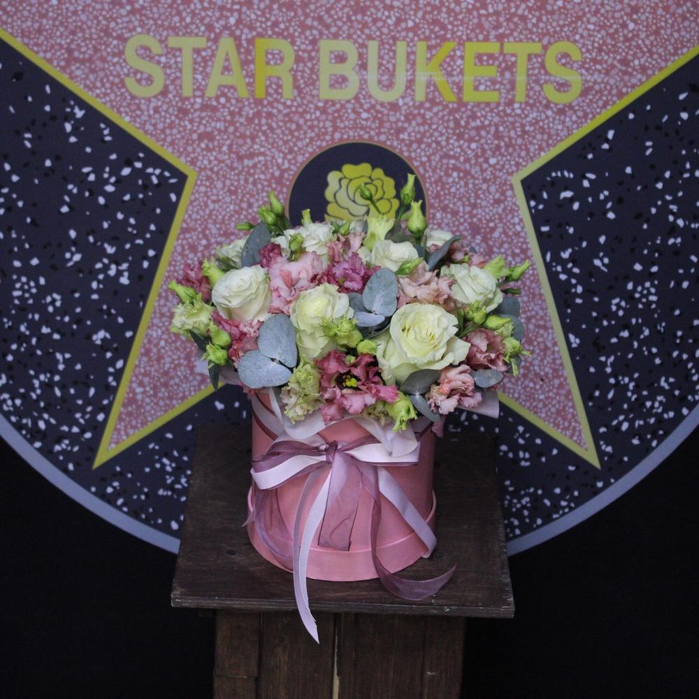 Роза Мондиаль – 9 шт.эустома махровая – 5 шт.Эвкалипт – 2 шт.Пленка дизайнерская – 1 шт.Оазис флористический – 1 шт.Лента атласная – 2 шт.Шляпная коробка – 1 шт.