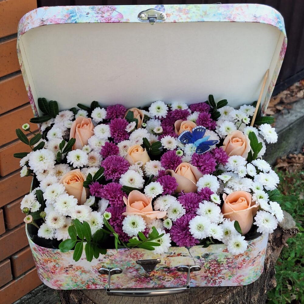 Центральным элементом этого букета микс цветов является красивый и стильный чемоданчик. Этот чемоданчик служит не только как контейнер, но и как часть композиции. Он придает букету оригинальность и изысканность, создавая атмосферу путешествий и приключений.
