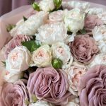 Авторский букет собран из кустовой пионовидной розы, а также эксклюзивного сорта пионовидной одноголосой розы в дополнение с молочными диантусами в декоративной упаковке.