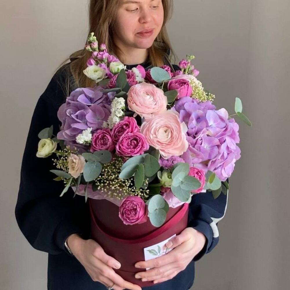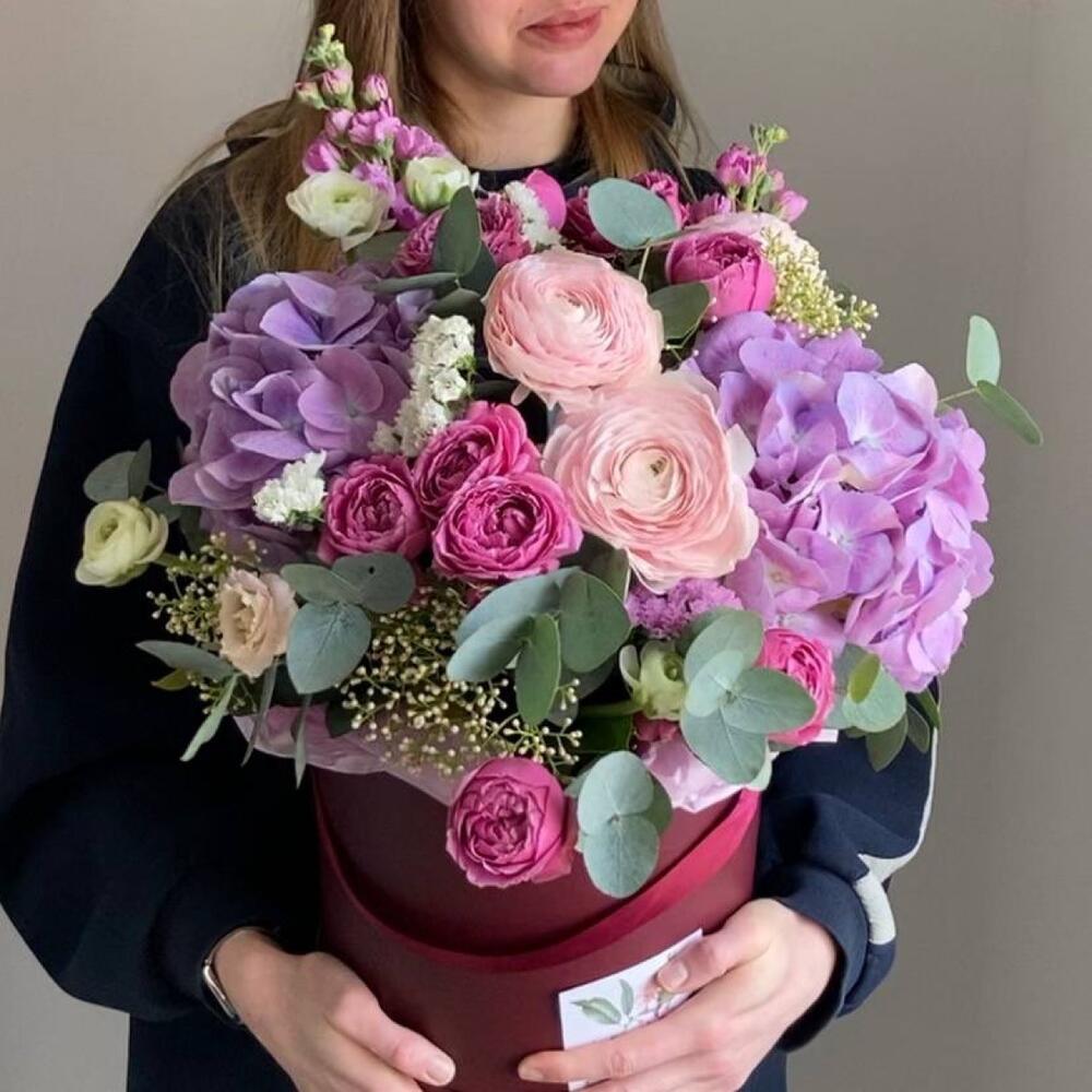 Садовая композиция в шляпной коробке с гортензиями, ранункулюсами, кустовыми пионовидными розам, душистой маттиолой, и эвкалиптом.