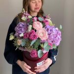 Гортензия – 2 шт.Маттиола – 3 шт.Статица – 2 шт.Эвкалипт – 5 шт.Коробка шляпная – 1 шт.Ранункулюс – 3 шт.Роза кустовая пионовидная – 3 шт.Оазис флористический – 2 шт.фотиния – 2 шт.