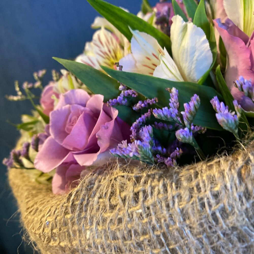Розы с альстромерией в мешковине