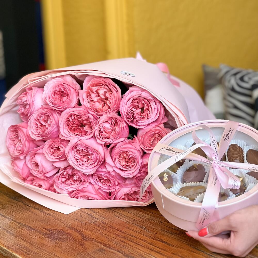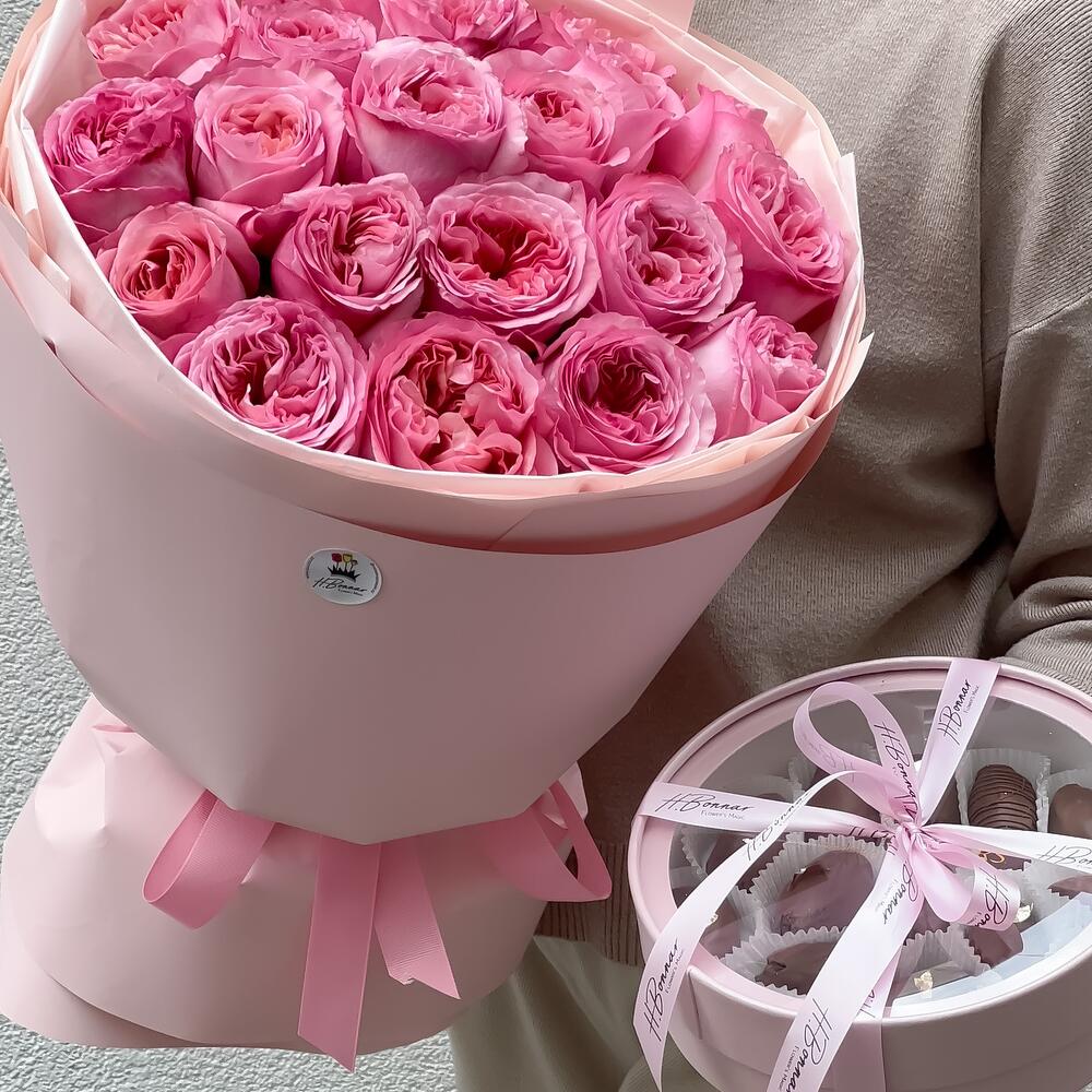 Монобукет из Английских садовых роз в премиальном оформлении + подарочная коробка королевских фиников в бельгийском шоколаде