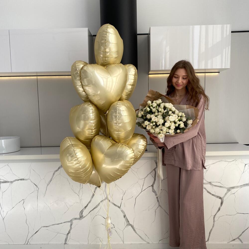 Стильный сет для девушки с шарами – сердцами и букетом кустовых роз В состав входят:- букет из 19 кустовых роз, в подарок стильная, крафтовая упаковка + лента – фонтан из 13 шаров – сердец + в подарок стильные ленты и грузик
