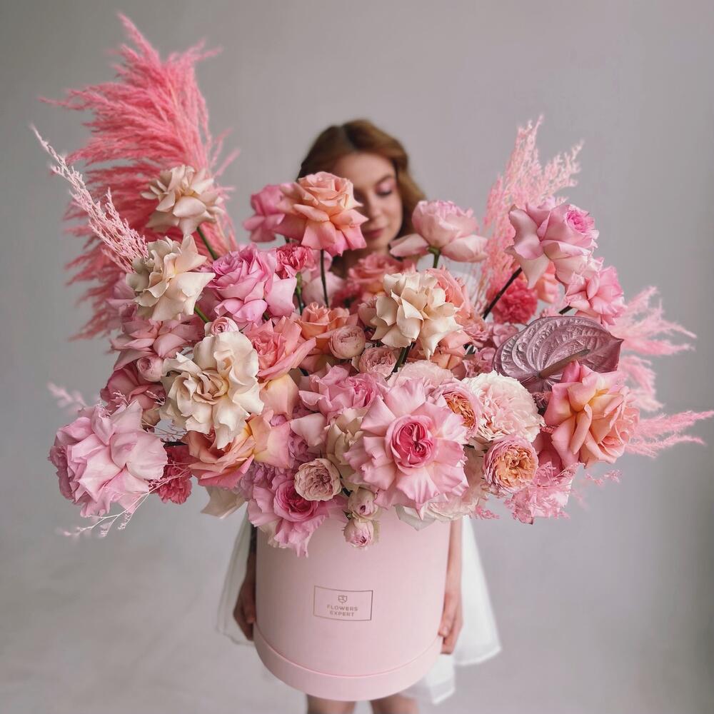 Антуриум – 1 шт.Кустовая роза – 11 шт.Сухоцветы – 9 шт.Шляпная коробка – 1 шт.Французская роза – 25 шт.