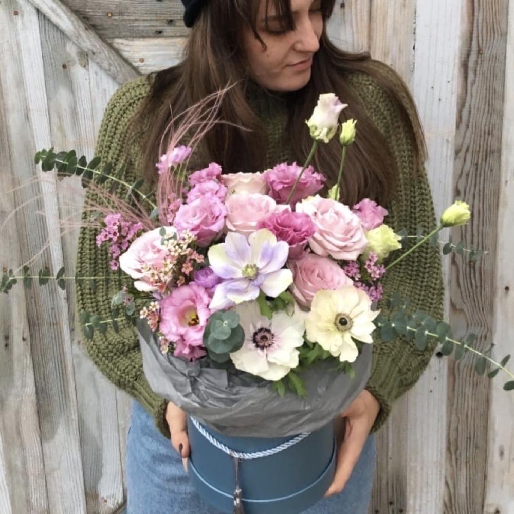Шляпная коробка с анемонами, розами, лизиантусом, ваксфлауэром, ковылем и эвкалиптом.