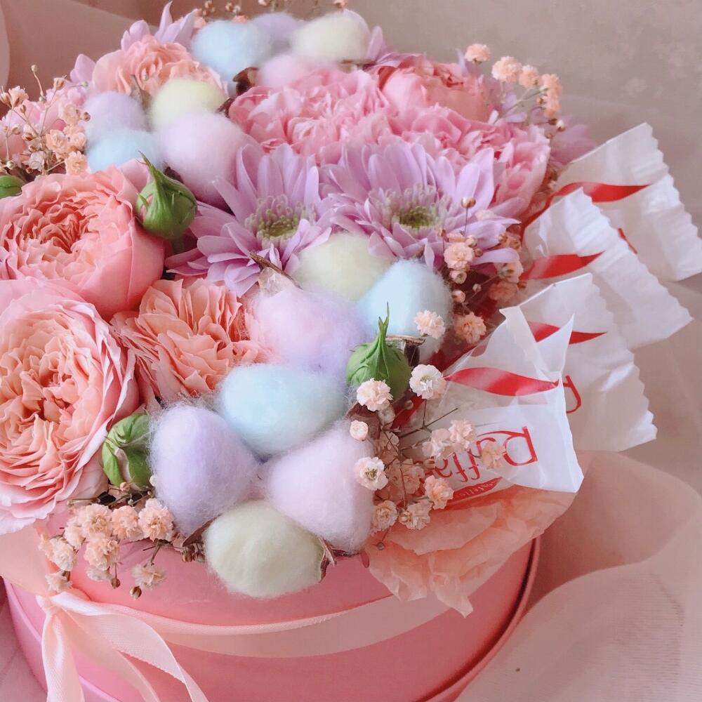 Гипсофила – 1 шт.Хризантема кустовая – 1 шт.Диантус – 3 шт.Конфеты Raffaello – 4 шт.Шляпная коробка с лентой – 1 шт.Пионовидная роза джульетта – 1 шт.радужный хлопок – 3 шт.