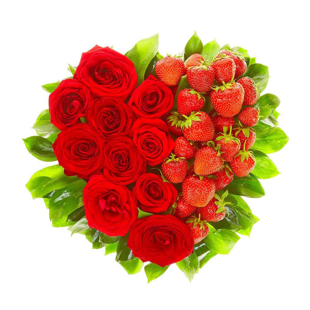 Клубника – 25 шт. красные розы – 11 шт.