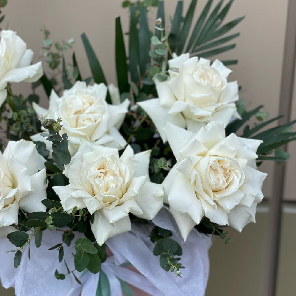 Эвкалипт – 4 шт.Роза Эквадор – 7 шт.Лента атласная – 2 шт.Тишью – 4 шт.Чико – 2 шт.Оазис флористический – 1 шт.
