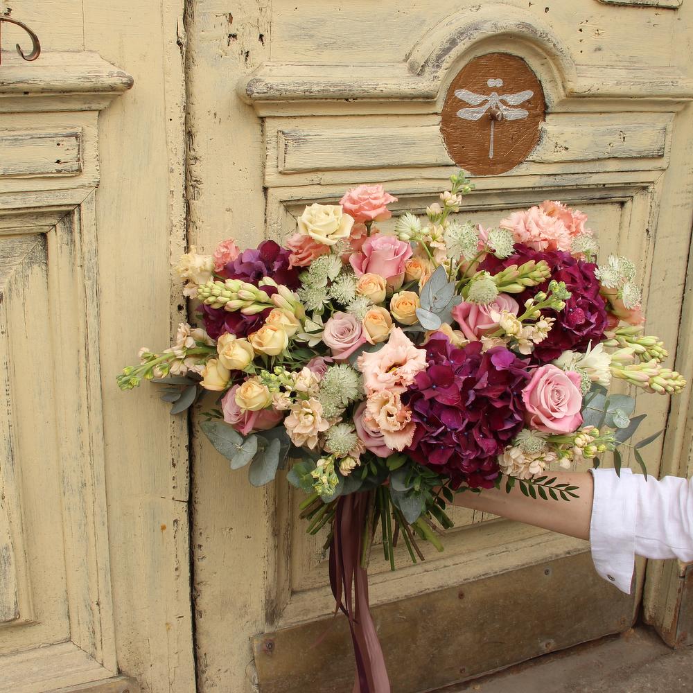 Раскидистый букет с гортензиями, эустомой, розами, маттиолой и эвкалиптом.Стильное цветочное решение для любого случая.Ширина букета около 60 сантиметров, высота букета около 60 сантиметров.