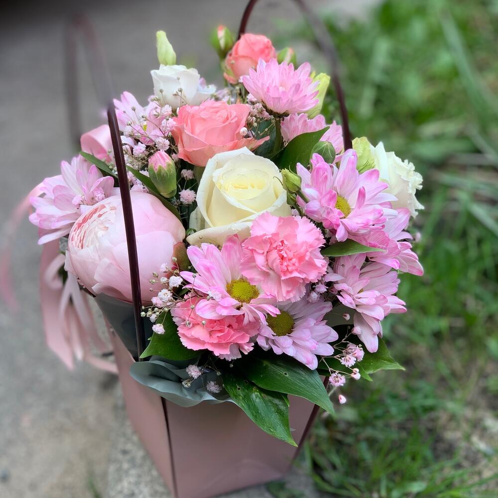 Пион – 1 шт.Роза кустовая – 1 шт.Хризантема кустовая – 1 шт.Роза – 1 шт.Гвоздика – 1 шт.Сумочка – 1 шт.зелень декоративная – 6 шт.