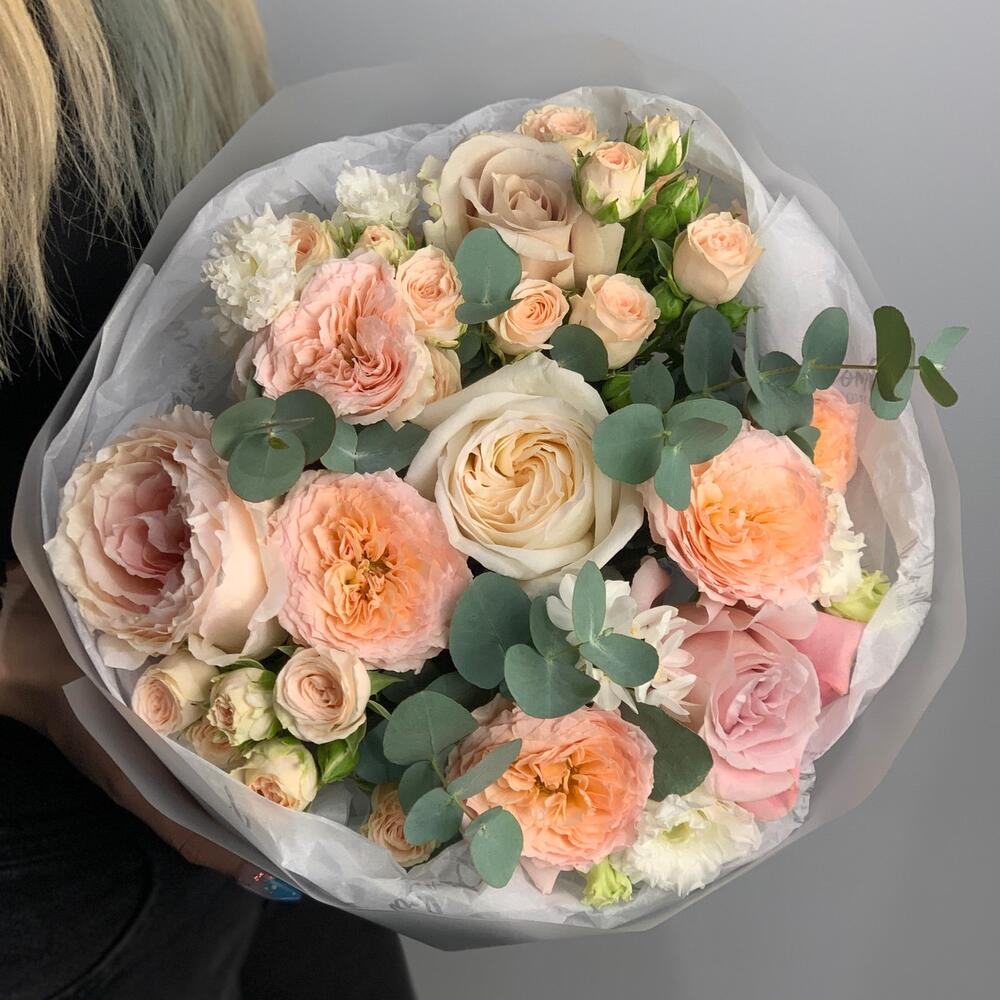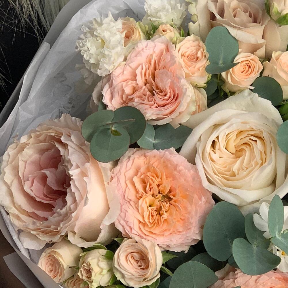 Альстромерии, Кустовые розы, Лизиантусы, Пионовидные розы, Розы, Ромашки