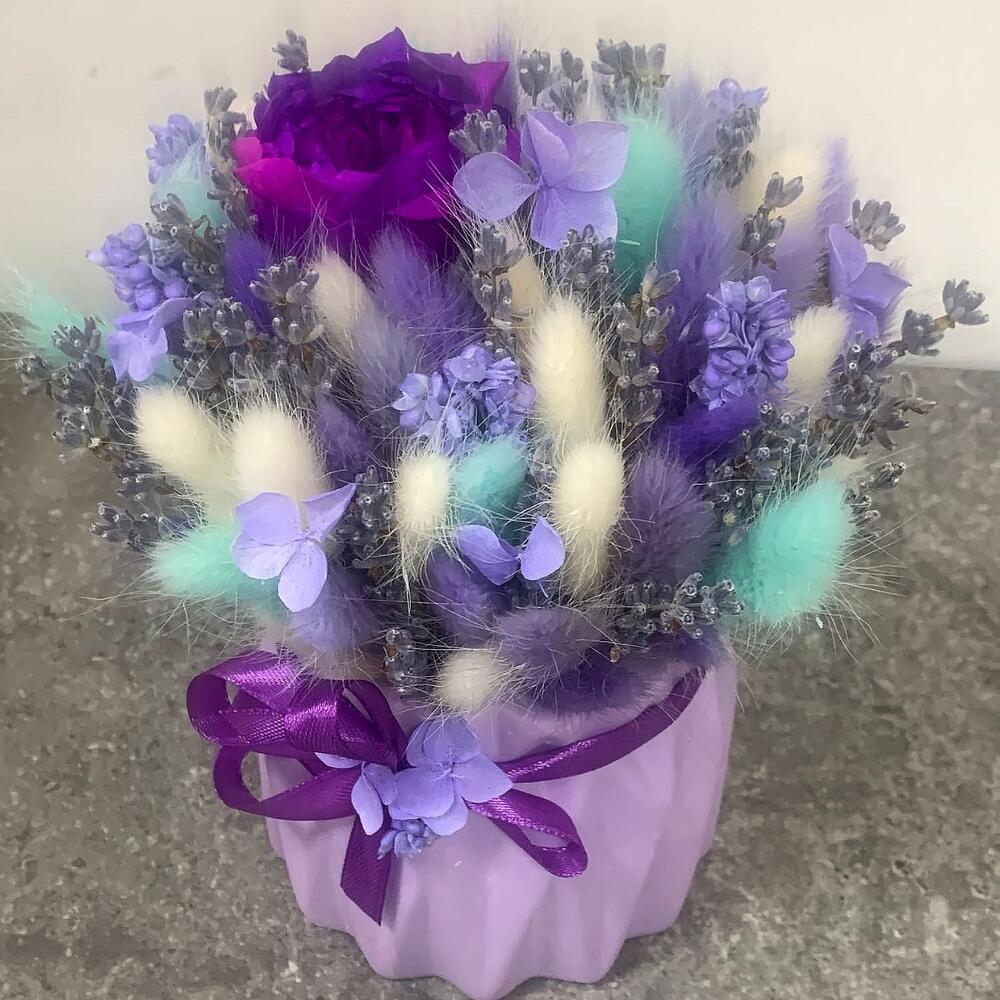 Ваза – 1 шт.Роза стабилизированная – 1 шт.Лаванда (сухоцвет) – 20 шт.Лагурус (сухоцвет) – 25 шт.гортензия стабилизированная – 1 шт.