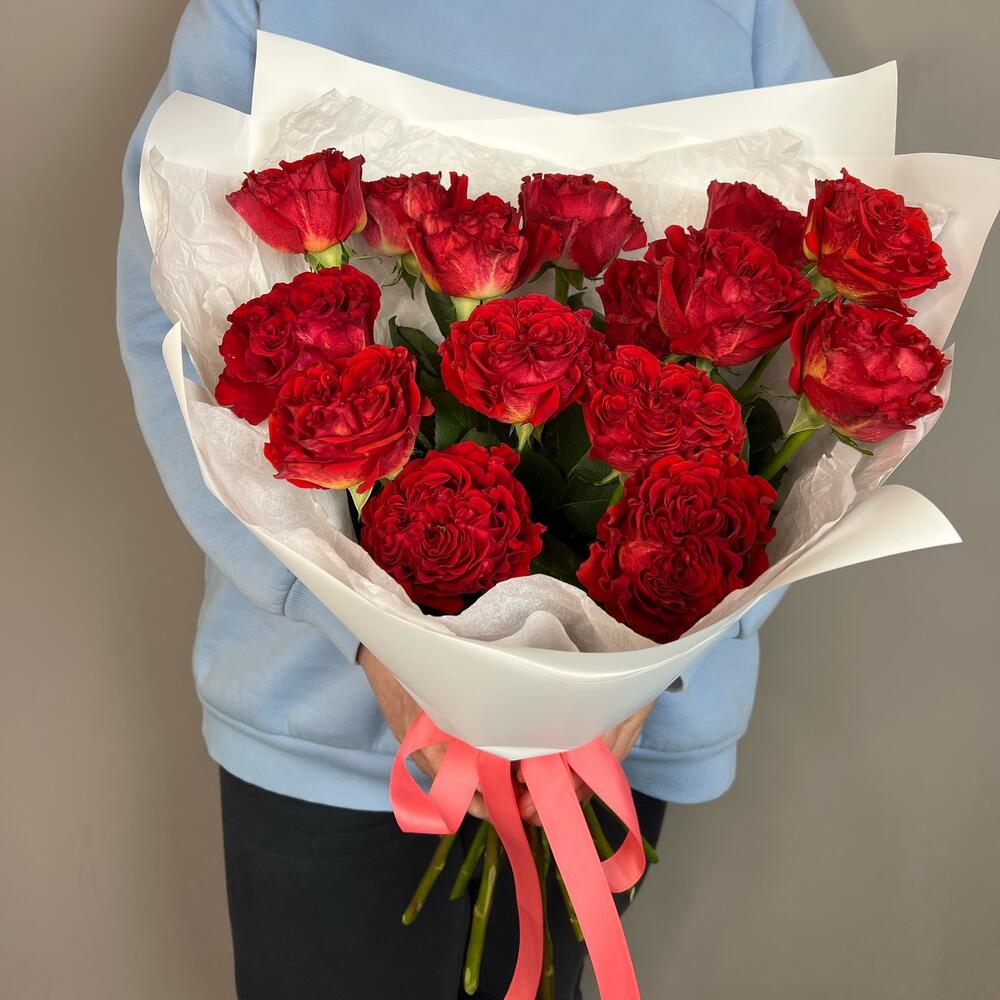 Вывернутые бархатные алые розы в белоснежной упаковке