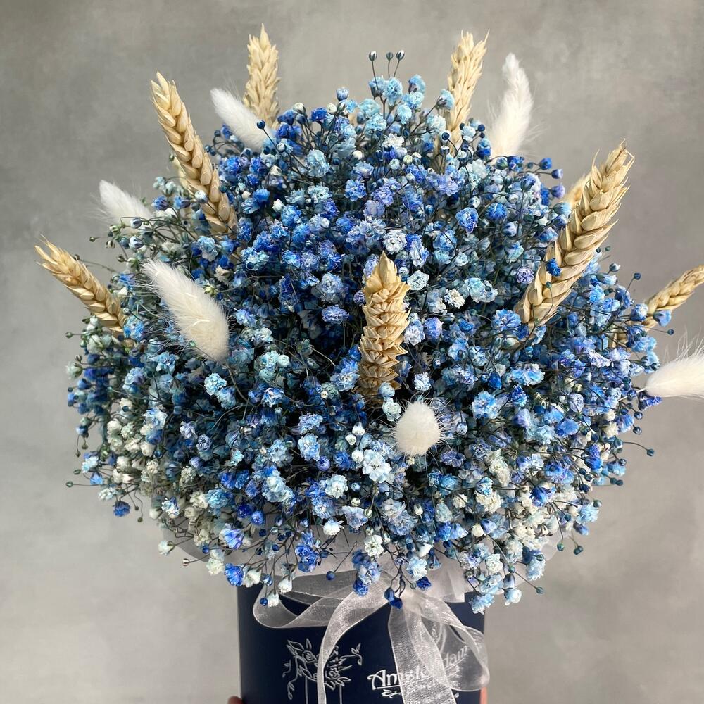 Коробка d12 – 1 шт.Оазис – 1 шт.Гипсофила – 7 шт.Пшеница (сухоцвет) – 11 шт.Лагурус (сухоцвет) – 9 шт.