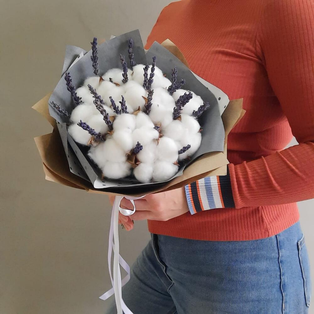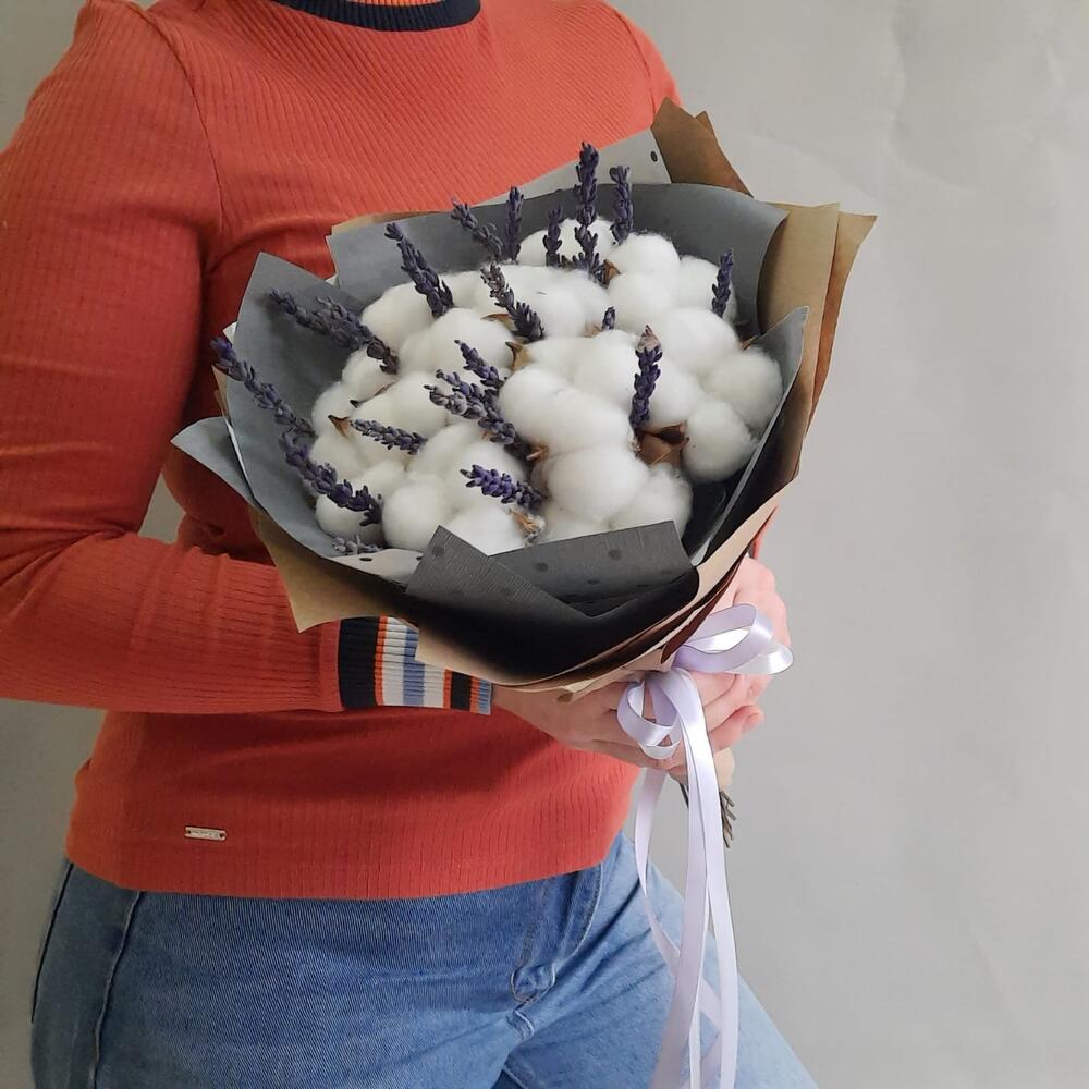 Хлопок натуральный – 11 шт.Лаванда – 15 шт.Упаковка крафт – 2 шт.Лента – 1 шт.