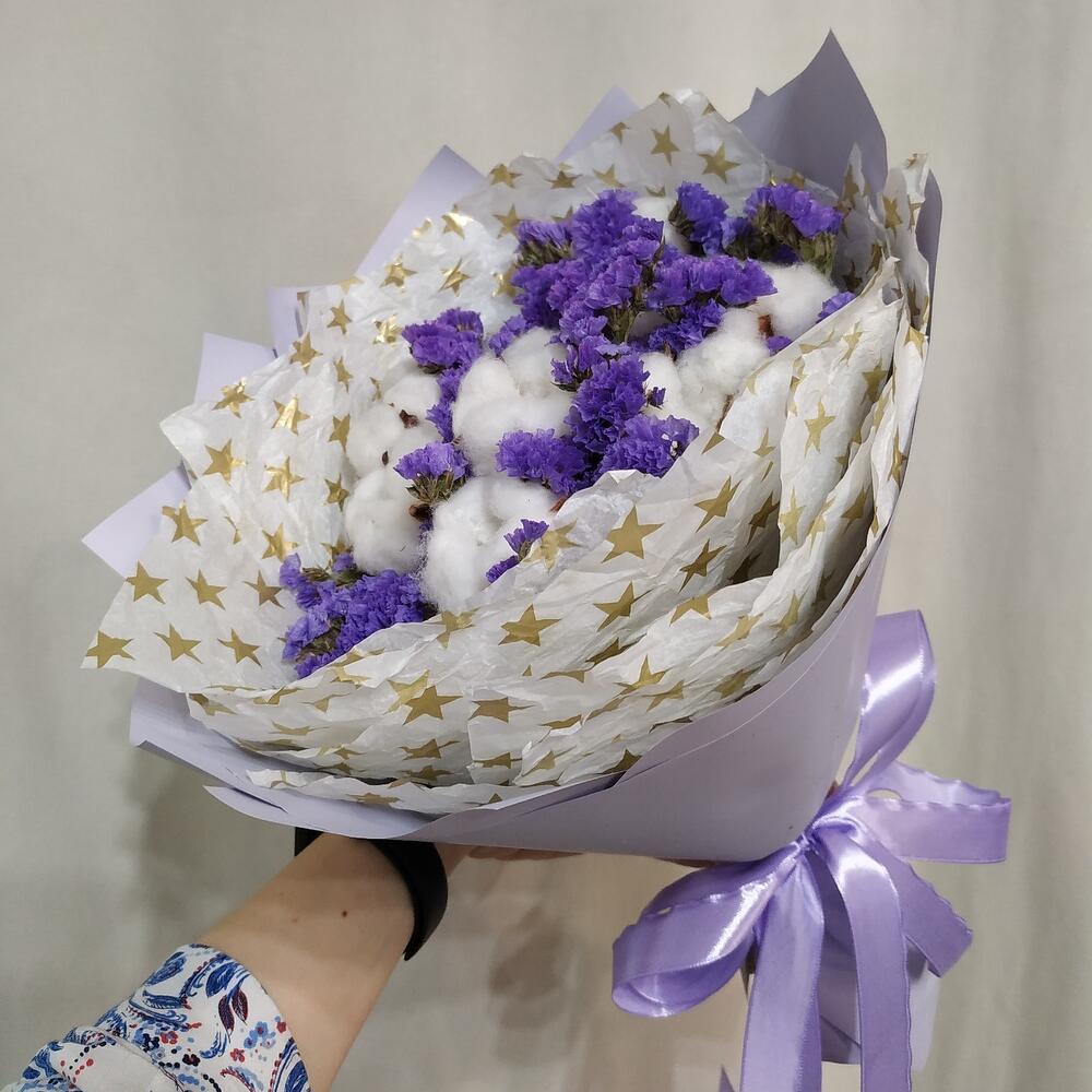 «Лавандовое созвездие» Букет из розы, гвоздики, статица и хлопка