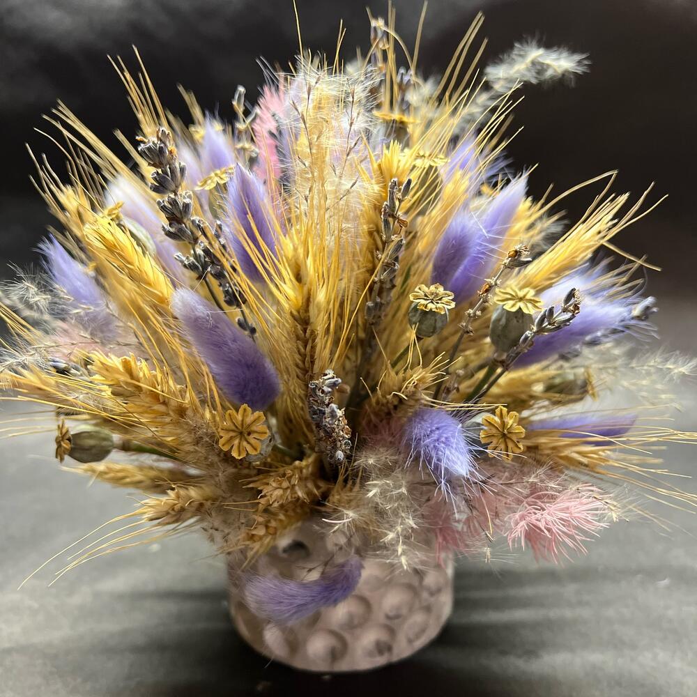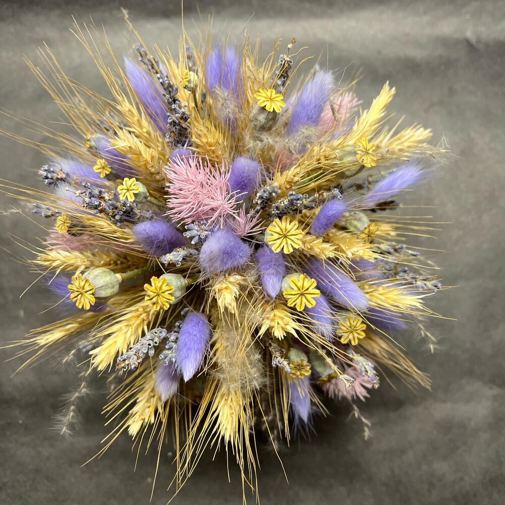 Колоски пшеницы – 20 шт.колосья мака – 10 шт.Лаванда (сухоцвет) – 15 шт.Лагурус (сухоцвет) – 20 шт.Кашпо керамическое – 1 шт.Оазис флористический – 1 шт.