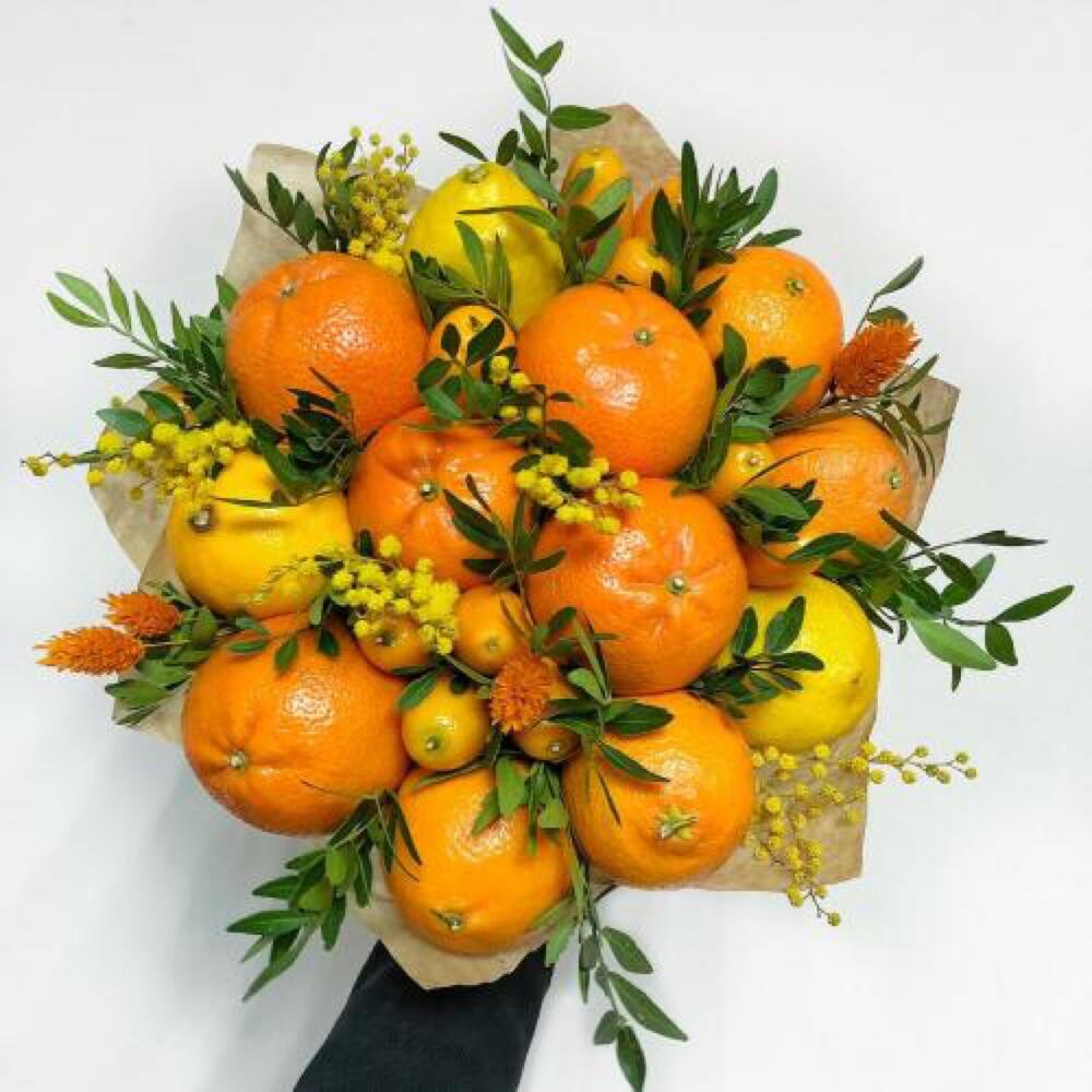 Апельсин – 2 шт.Мандарин – 4 шт.Лимон – 2 шт.Кумкват – 3 шт.Мимоза – 3 шт.Фисташка – 5 шт.Сухоцветы – 5 шт.