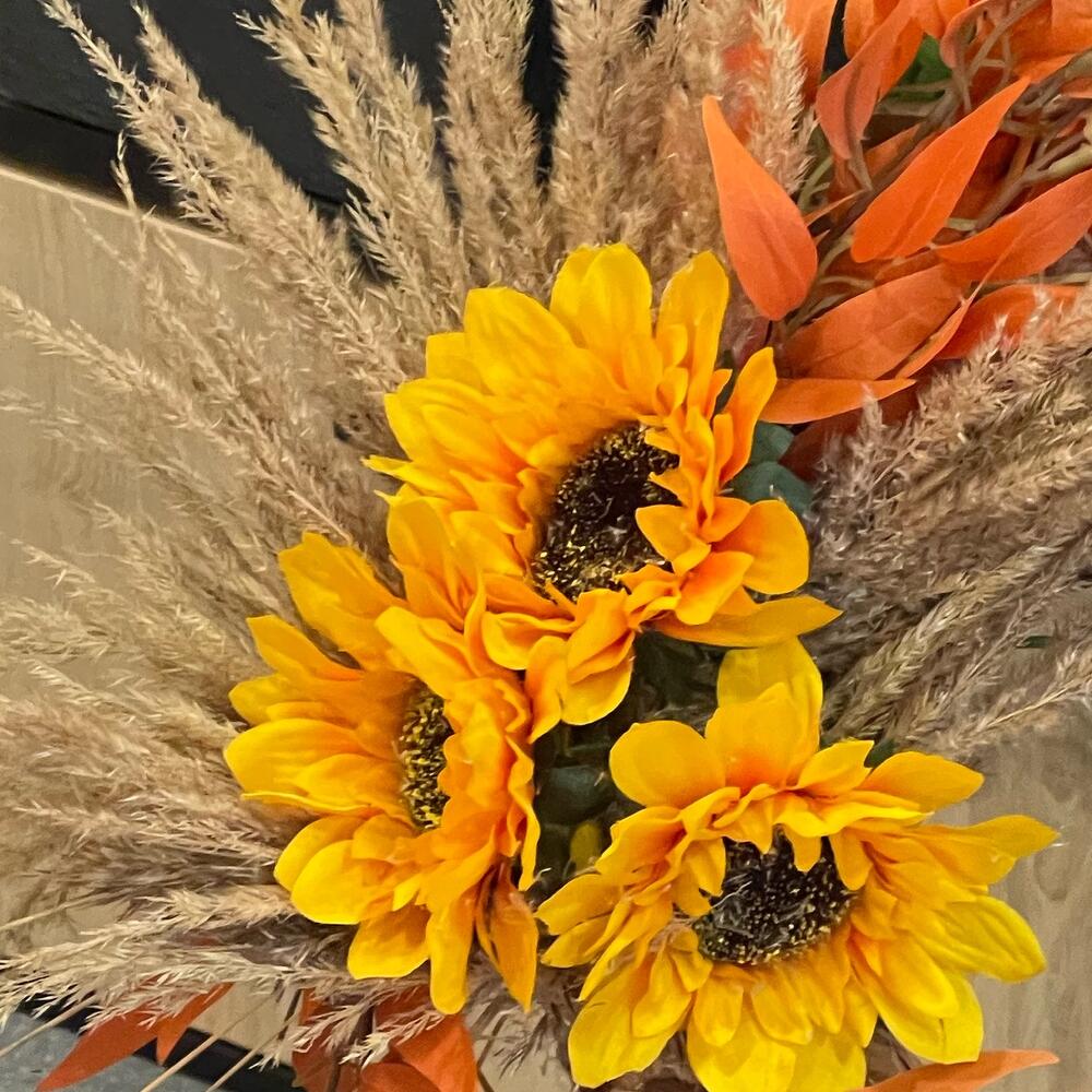 искусствееная ветка осенняя – 6 шт.подсолнух желтый искусственный – 3 шт.сухоцветы пучок – 6 шт.Венок – 1 шт.