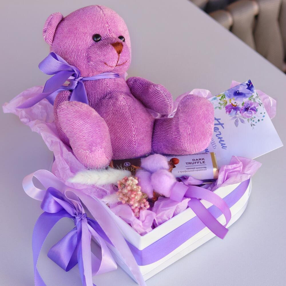 Прекрасный подарочный набор в синревых оттенках с мишкой, шоколадкой, букетом сухоцветов и открыткой не оставить равнодушной ни одну получательницу❤️К подарочному набору по Вашему пожеланию мы будем рады добавить конфеты, свечи, цветы и б/а вино.