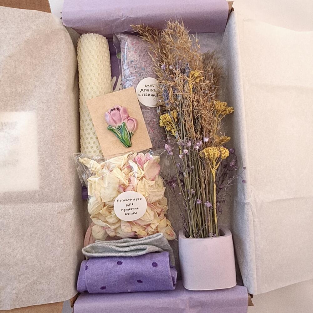 Шоколад – 1 шт.Подарочная упаковка – 1 шт.Лепестки роз – 1 шт.Подсвечник – 1 шт.Соль для ванной – 130 гр.носки женские – 1 шт.букет из сухоцветов – 1 шт.свеча из вощины – 1 шт.брошь ручной работы – 1 шт.