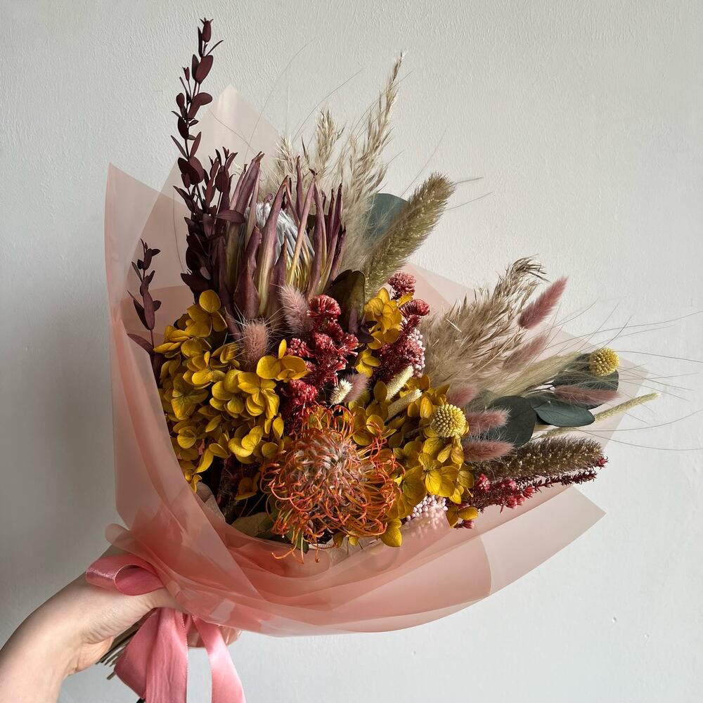 Гортензия – 1 шт.Озотамнус – 1 шт.Протея – 1 шт.Эвкалипт – 3 шт.Нутан – 1 шт.Капс – 1 шт.Упаковка дизайнерская – 1 шт.Ковыль – 2 шт.Лагурус – 9 шт.Сетария – 2 шт.Флум – 9 шт.пампас – 1 шт.