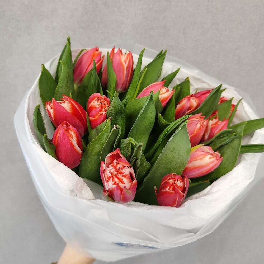 Тюльпан пионовидный – 15 шт.Авторская упаковка – 1 шт.Атласная лента – 1 шт.