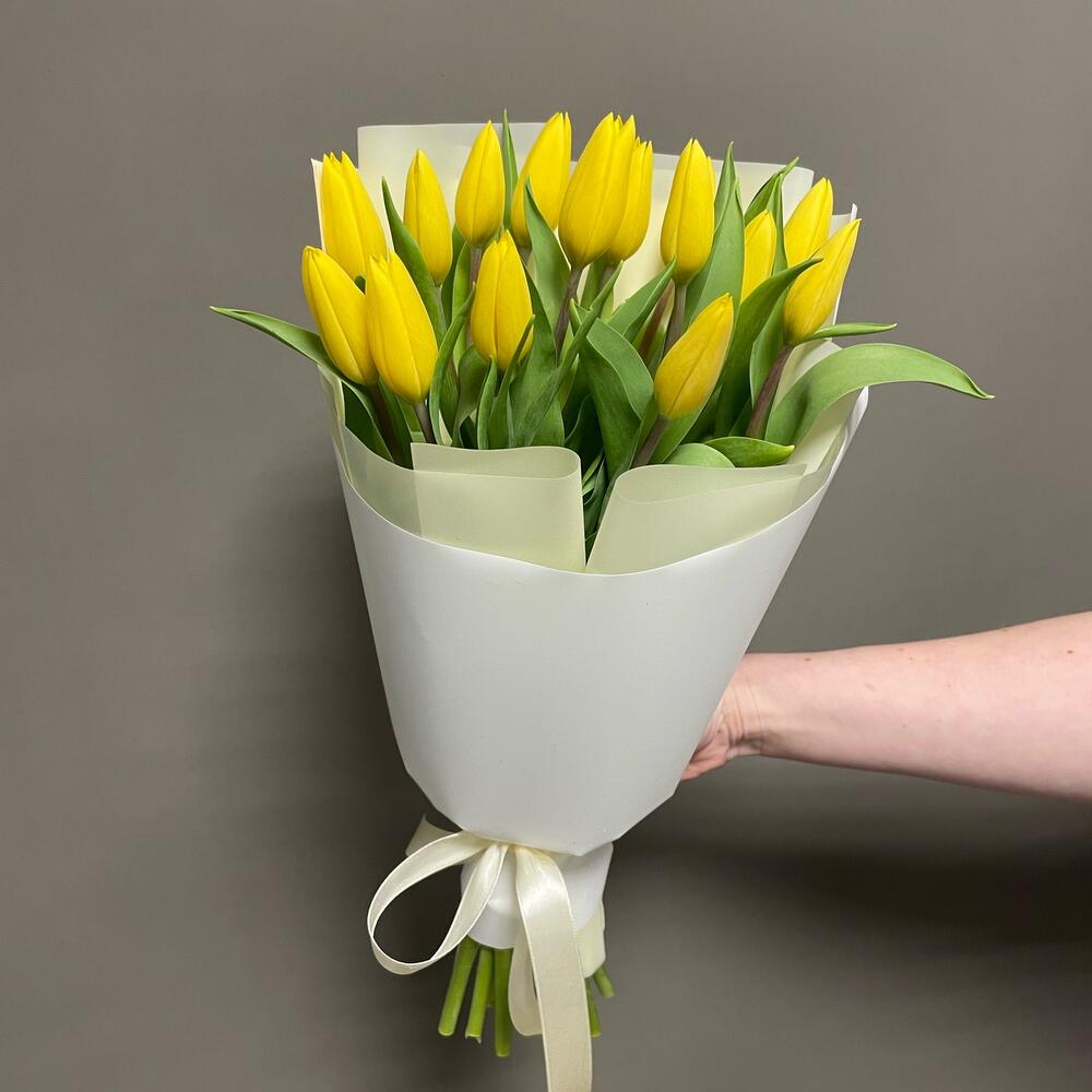 Лента атласная – 1 шт.Упаковка дизайнерская – 1 шт.Желтый тюльпан – 12 шт.