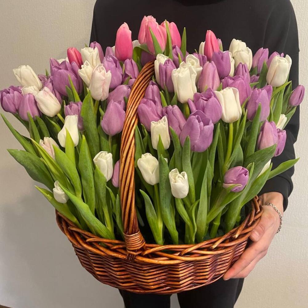 Тюльпан – 101 шт.Корзина плетеная – 1 шт.Оазис флористический – 4 шт.