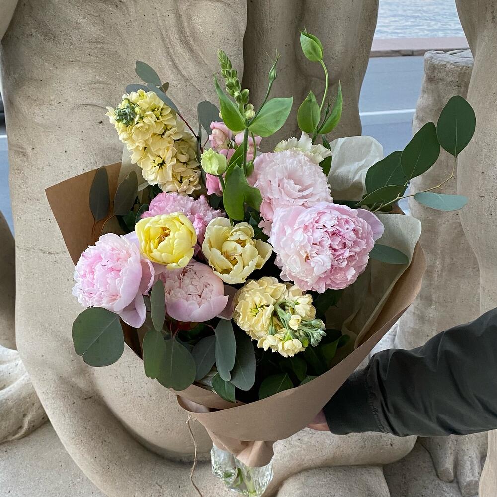 Пион – 3 шт.Маттиола – 2 шт.Львиный зев – 1 шт.Тюльпан махровый – 3 шт.Лизиантус – 1 шт.Эвкалипт – 3 шт.Упаковка – 1 шт.